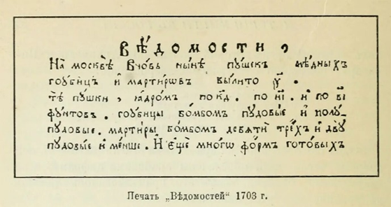 • 1703 г. — по указу Петра I вышла первая русская печатная газета «Ведомости».