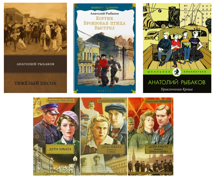 Литературный дебют Рыбакова состоялся, когда ему было 37 лет. «Кортик», «Приключения Кроша», «Бронзовая птица» – этими произведениями зачитывались школьники нескольких поколений. Свежесть чувств, острота переживаний, манящие тайны, пионерская романтика, запутанные дворы Арбата… Все эти повести стали классикой юношеского чтения и впоследствии были экранизированы.